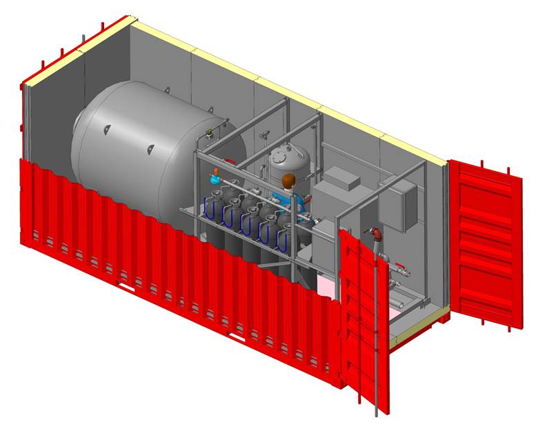 Принцип работы Основным элементом модуля является пеногенерирующее устройство, которое обеспечивает формирование компрессионной пены путем одновременного смешивание под давлением воды, пенообразователя и сжатого воздуха (или азота). Производительность устанавливаемого внутри блок-бокса стандартного пеногенерирующего устройства может составлять от 3 до 24 л/с (по условному раствору). Запас воздуха хранится в баллонах высокого давления и подается через редуктор. Пенообразователь и вода хранятся в специальных баках из нержавеющей стали. Готовая пена подается к очагу пожара по стационарным трубопроводам или оперативно прокладываемым рукавным линиям. Вместо или в дополнение к баку с запасом воды, входящему в состав установки, источником водоснабжения может служить противопожарный водопровод (напорный или безнапорный) или передвижная пожарная техника. В случае подачи воды от безнапорного пожарного водопровода блок-бокс комплектуется модульной насосной станцией. Включение модуля обеспечивается как электрическим импульсом= 24 В 0,7 А (автоматически или дистанционно), так и местно – простым поворотом пускового клапана. Готовность к пуску – немедленная. По желанию заказчика установка комплектуется компрессором с электроприводом для пополнения запаса сжатого воздуха после его израсходования на испытания или тушение пожара. Обслуживание модуля – периодический визуальный контроль давления в баллонах (по манометру) и уровня воды и пенообразователя в резервуарах (по водомерному стеклу). Преимущества применения автономного блок-бокса пенного пожаротушения с применением компрессионной технологии перед классическими способами противопожарной защиты. Низкие капитальные затраты: • отказ от монтажа стационарных противопожарных систем и затрат на обеспечение первой категории надежности их электроснабжения за счет включения типового блок-бокса в состав объекта (эшелона); • сокращение объёмов и сроков выполнения строительных работ; • сокращение площади размещения противопожарного оборудования; • однажды вложенные затраты на приобретение блок-бокса обеспечивают защиту при перебазировании объекта на другие площадки. Низкие эксплуатационные затраты: • снижение эксплуатационных затрат за счёт отсутствия специальных трудоемких процедур технического обслуживания; • не требует включения в штат предприятия дополнительного персонала, как для обслуживания, так и для применения изделия по назначению; • простота освоения противопожарного оборудования персоналом; • невысокое энергопотребление обогрева даже при экстремально низких температурах наружного воздуха. Дополнительные преимущества. • работоспособность при полном отсутствии на объекте какого-либо электропитания; • полноценная противопожарная защита объекта с самого начала его сооружения • высокая оперативная готовность к немедленному применению по назначению; • высокая эффективность тушения; • большая дальность подачи пены, при тушении пожара обеспечивающая работу пожарного расчета с безопасного расстояния; • хранение в составе блок-бокса полного комплекта противопожарного оборудования и снаряжения; • допускает длительные перерывы в обеспечении электроподогрева при отрицательных наружных температурах. Предлагаемое техническое решение мо